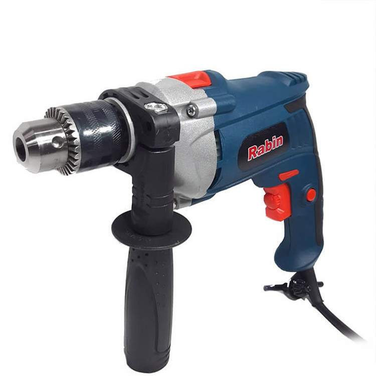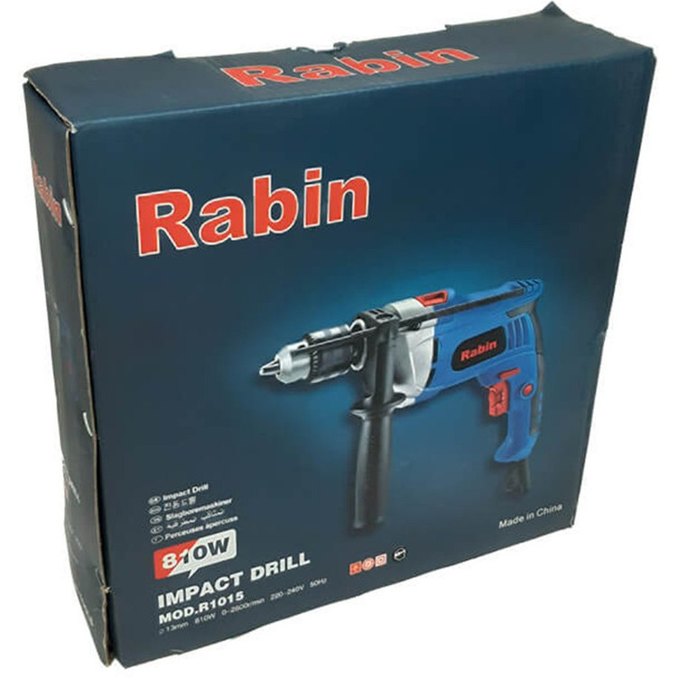 دریل چکشی رابین 810 وات مدل R1015، بسیار سبک و کم حجم جهت انجام کلیه کاربریهای نصب در صنایع مختلف فلز، چوب و بتن - کلید الکترونیک راستگرد/چپگرد، ضدغبار مطابق با استاندارد TUV - دریل چکشی رابین دارای سهنظام آچاری ۱۳ میلیمتری - دارای حالت چکشی برای استفاده در سطوح سخت - مجهز به دسته جانبی گردان ۳۶۰ درجه ارگونومیک - کنترل سرعت گردش با میزان فشار به شستی - دارای دکمه قفلکن کلید در وضعیت روشن - کلید دیمردار جهت تنظیم سرعت - دارای نیم تنه فلزی - دارای کیفیت بالا مقرون به صرفه و ارزان