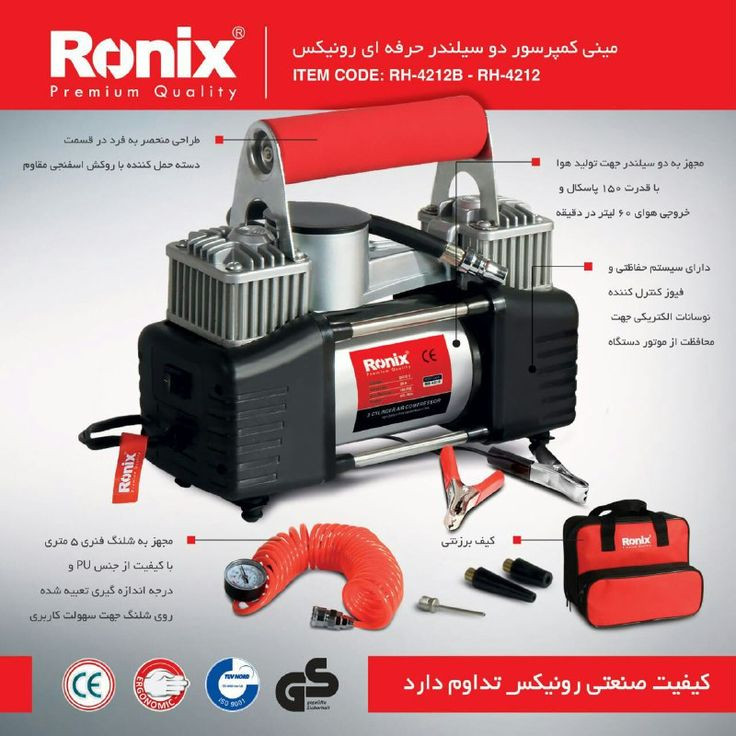 کمپرسور باد دو سیلندر اتومبیل رونیکس مدل RH-4212B ابزاری کاربردی و پرکاربرد برای باد کردن تیوپ، توپ و سایر وسایل بادی است. این دستگاه با توان 12 ولت و فشار 150 PSI، قادر به انجام کارهای معمولی و نیمه سنگین میباشد.
